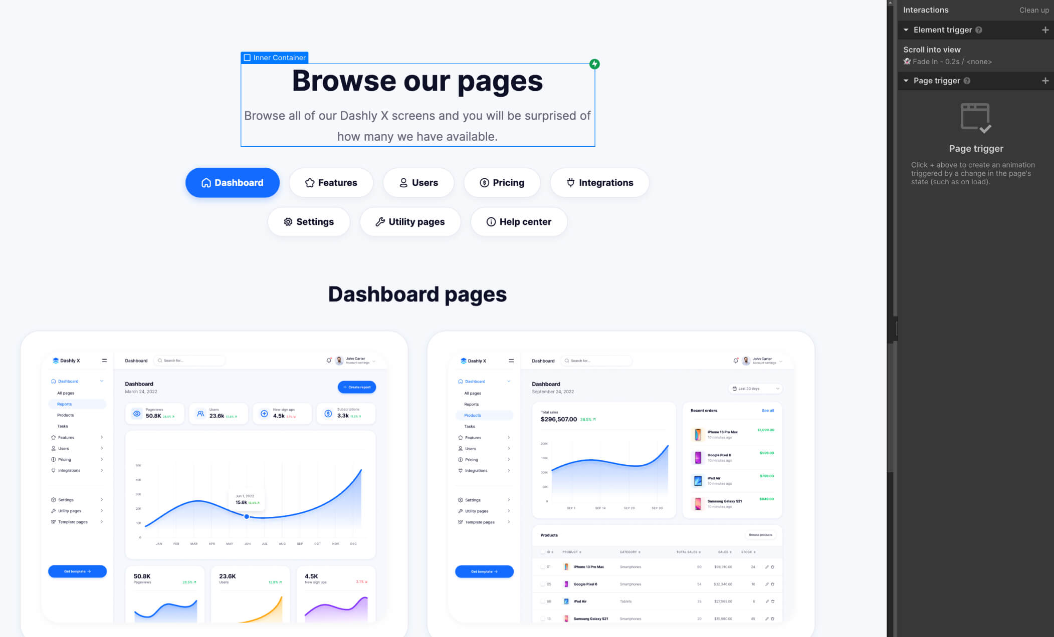 As you could see above, Dashly X was built on Webflow using the best practices to make it very easy for you to edit the template and customize it to your needs.