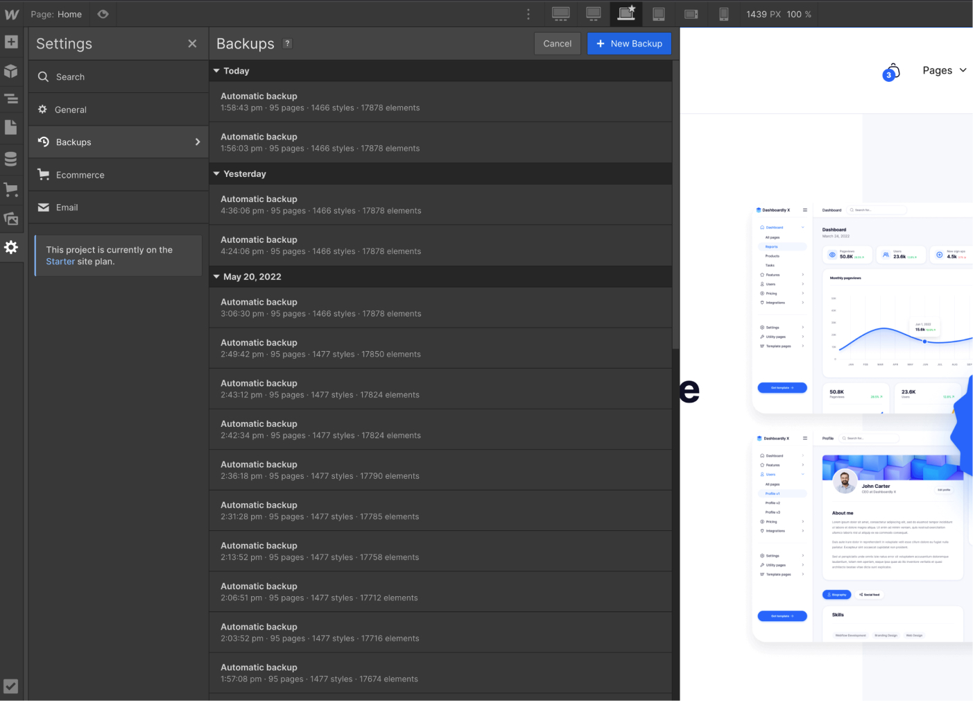 If something goes wrong, for example, if you are not liking where the website is going to, if you deleted some critical classes that were required to make the Template look nice, or if you just want to go to a previous version for any reason, you can always go to the Backups section.